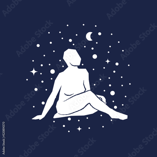 Мечтательная расслабленная молодая женщина, завернутая в одеяло, сидит на подоконнике, глядя сквозь стекло на ночное звездное небо, отдыхая дома в квартире векторная иллюстрация