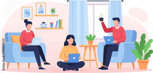 Молодая женщина учится дома. Девушка, сидящая в кресле с ноутбуком, плоская векторная иллюстрация. Дистанционное обучение, дистанционное образование, фриланс. Домашнее обучение.