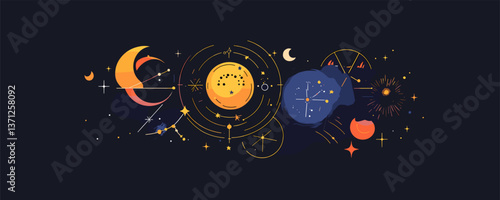 Зодиакальное колесо с двенадцатью знаками гороскопа, планетами, звездным небом, векторная иллюстрация в стиле бумажного искусства. Личный гороскоп. Шаблон астрологического плаката.