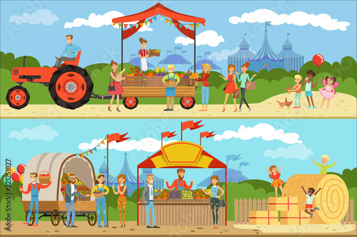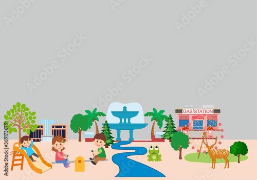 Векторная иллюстрация плоского стиля животных зоопарка. Родители со своими детьми видят диких экзотических животных в клетках - жирафа и льва. Павлины бродят среди людей. Фотографируюсь с тигром и попугаем.