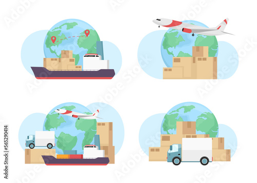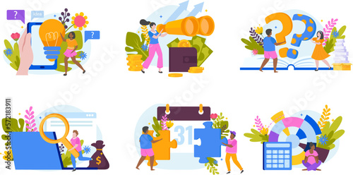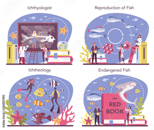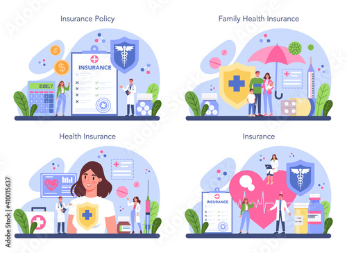 Набор для зоопарка. Векторная плоская иллюстрация. Вход в зоопарк, вывески с экзотическими, лесными и полярными животными. Счастливая семья кормит морковью детеныша жирафа, дети наблюдают за обезьянами на веревочной лестнице и качелях.