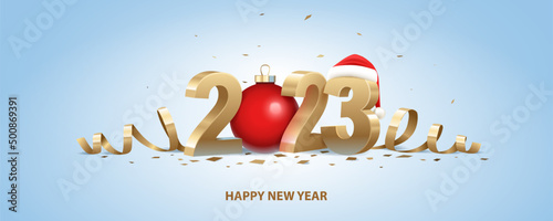 Happy New Year 2023. Golden 3D numbers with Santa hat, red Christmas ball and confetti on a light blue background.