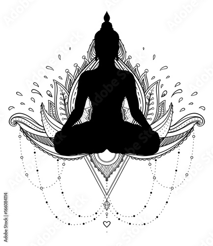Vector ornamental Lotus flower with silhouette of Buddha, ethnic art, Indian paisley. Hand drawn illustration. Invitation element. Tattoo, spirituality, boho, magic symbol.