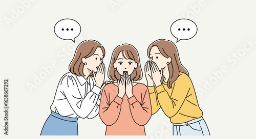 Women gossiping, whispering in ear, slandering, spreading secrets. Woman surprised when her friend talks whispering in her ear. Flat  vector illustration isolated on white background