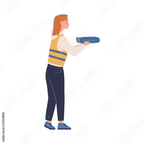 Volunteer giving donation box with used clothes, food. Woman helping, donating cardboard to poor needy homeless people. Charity, support concept. Flat vector illustration isolated on white background