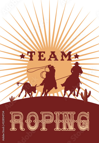 A rodeo logo with western design elements and a silhouette cowboy calf roper.