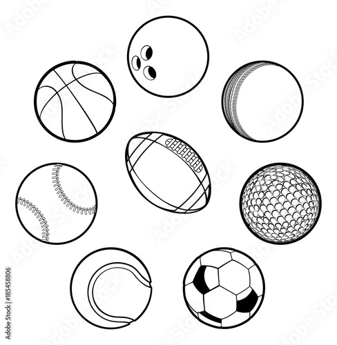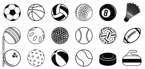 Big set of soccer ball, volleyball, basketball, american football. Sports equipment. Game. Collection of design elements. Great for banners, sites, posters. Vector illustration. Hand drawn doodle