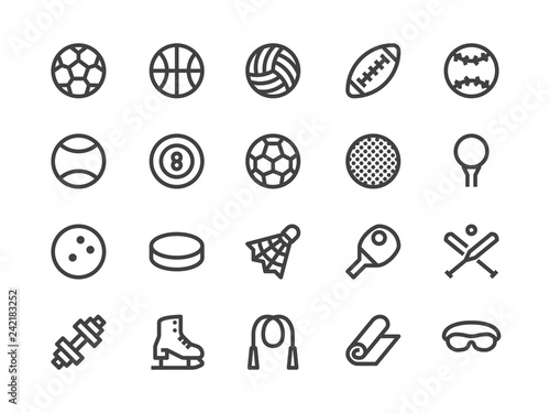 Sports Equipment Line Icon. Vector Illustration Flat style. Included Icons as Sport Balls, Basketball, Handball, Football, Badminton, Dumbbell and more. Editable Stroke. 30x30 Pixel Perfect