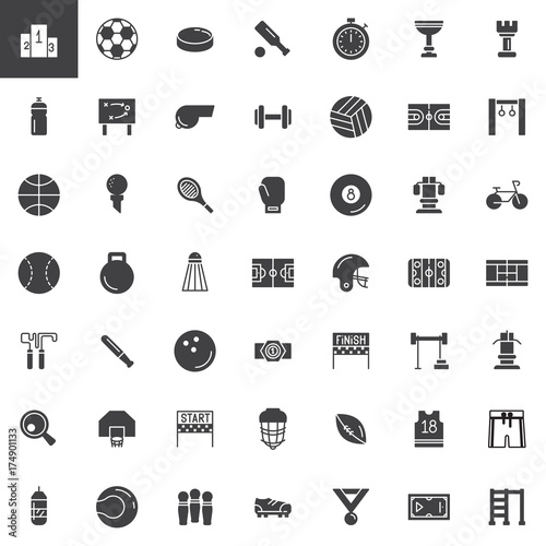 Sports equipment vector icons set, modern solid symbol collection, filled pictogram pack. Signs, logo illustration. Set includes icons as podium, football, dumbbell, volleyball, basketball