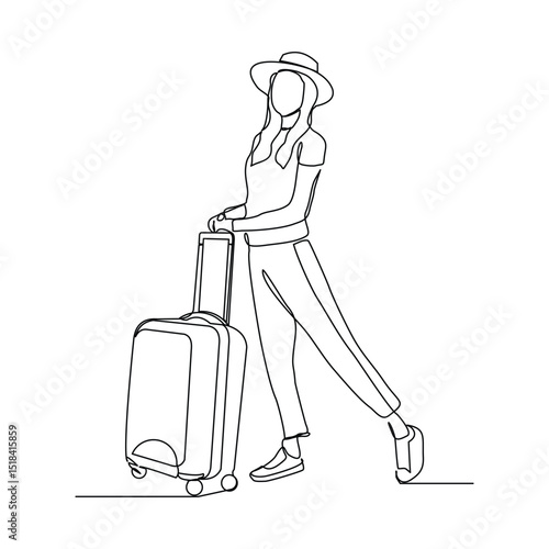 A single continuous line drawing of a traveler woman carrying luggage, depicting a tourist walking with a suitcase in a modern illustration style.