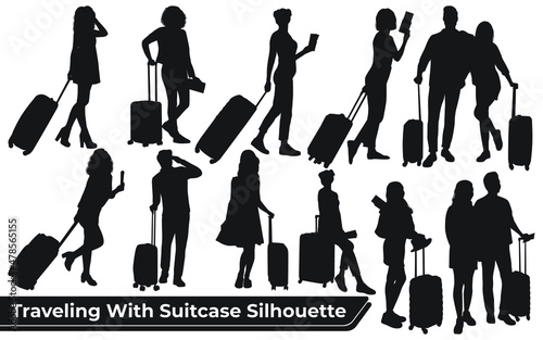Silhouettes of traveling people, walking passengers with luggage, business travelers, airport commuters, journey concept, vector traveler collection, tourism graphic set