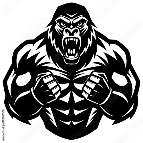 Vector logo of a raging gorilla doing a fist punch. Professional logo of a mad kong. Black and white logo of an ape isolated on a white background.