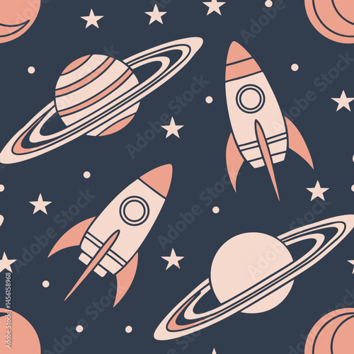 Space landscape with scenic view on planet, rocket and stars made with retro styled dotwork