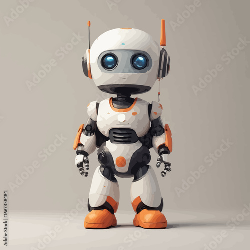 Flat vector illustration of eco-friendly assembly robots building green products with energy-efficient equipment. Solid tones, no gradients, sustainable industrial automation