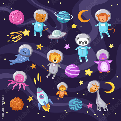 Two astronaut in space. Children book illustration or book cover template with beautiful scenery