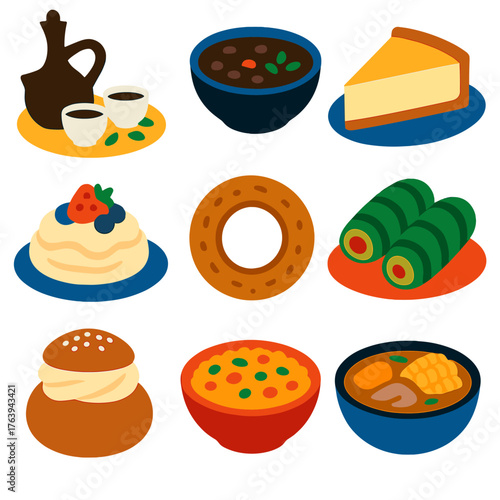 Icon set of international foods including sushi, taco, pizza, croissant, pad thai