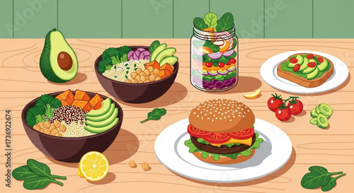 Flat lay illustration of healthy breakfast foods, including avocado toast, a fruit smoothie bowl, and fresh vegetables like peppers and broccoli.