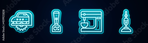 Set line Frying pan, Electric mixer, Coffee machine and Spoon. Glowing neon icon on brick wall. Vector