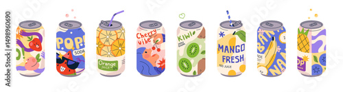 Set of soft drinks in tin cans. Metal bottles of soda with fruit, berry flavours. Aluminum containers of sparkling water. Packages of refreshing beverages. Flat isolated vector illustrations on white