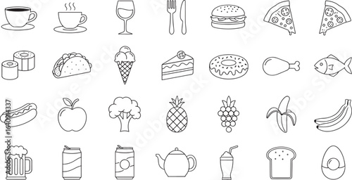 Line art icons representing various food and drink items including fast food fruits and beverages