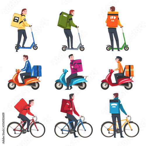 Delivery and courier service concept. Set of delivery man. Riding bicycle. Driving moped or scooter to deliver food or packages in time and holding box or package in hand. Vector illustration