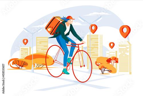 Cyclist delivery service concept  in the city. Girl courier. Young people doing job fast. City map with points. Flat colorful cartoon illustration. Isolated on white background