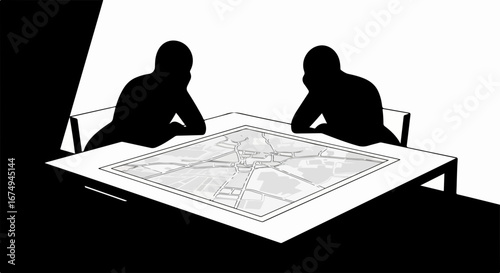 Silhouette of an Engaging Dialogue: A stark black and white silhouette depicts a captivating scene of group discussion.