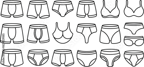 Collection of various underwear styles for men and women in a simple line drawing silhouette