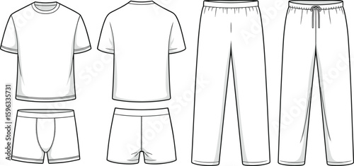 Men’s t-shirt boxer briefs and pants front back view, cad drawing flat vector template for fashion design and garment mockup