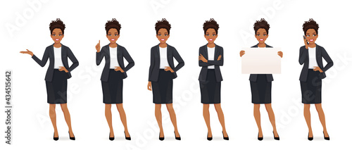 Young businesswoman boss cartoon in black suit set vector illustration. Types of smart woman in various poses. Collection of african-american characters performing different actions flat style concept