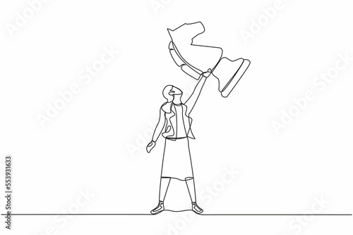 Single one line drawing young businesswoman holding horse chess piece. Successful entrepreneurship tactics or strategy, superiority in business. Continuous line draw design graphic vector illustration