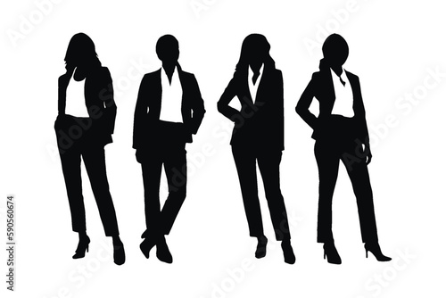 Stylish businesswoman silhouette vector collection. Business ladies silhouette set wearing suits and standing in different poses. Modern female business and office staff silhouette bundle.