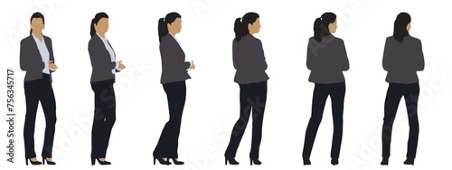 CAD Drawing. Vector illustration of businesswoman, standing walking in front back and side view. Symbol for architecture and landscape design drawing.