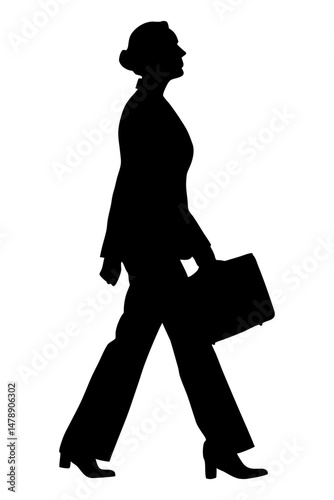 A cute chibi cartoon of a professional businesswoman in a suit walking while holding a clipboard.