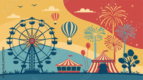 Colorful amusement park vector illustration with carnival rides, Ferris wheel, carousel, circus tents, balloons, fireworks, hot air balloon, train, tickets booth, festival elements