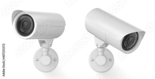 Security cam, cctv video camera, street observe surveillance equipment front and side angle view. Secure guard eye and crime prevention isolated on white background. Realistic 3d vector illustration