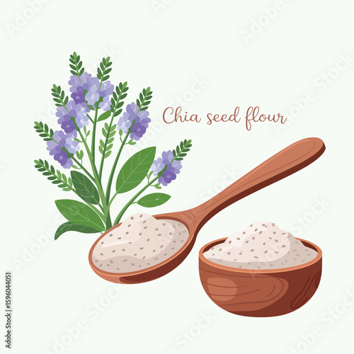 Illustration of chia seed flour in a wooden spoon and bowl with plant elements