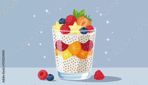 A vibrant illustration of a chia seed pudding in a glass jar, topped with fresh raspberries, blueberries, and mint leaves, showcasing a healthy and delicious snack.