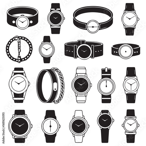 Collection of diverse wristwatch designs featuring classic and modern styles displayed as line art vector