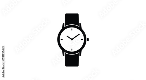 A minimalist illustration of a classic analog wristwatch with a white dial and black leather strap against a white background