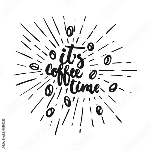 Hand drawn typography lettering phrase It's coffee time with coffee beans and light rays isolated on the white.