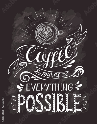 Coffee banner with quote on the chalk board. Coffee makes everything possible .