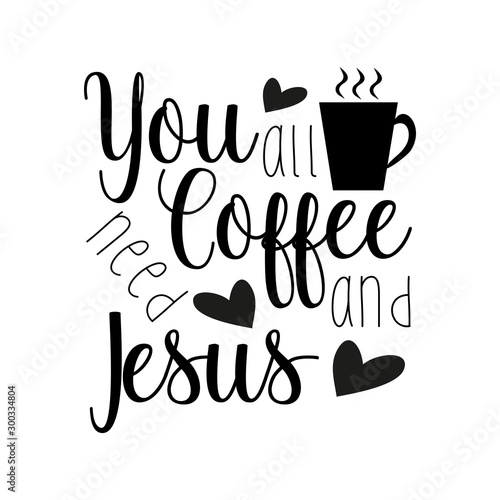 You all need coffee and Jesus- funny saying text, with coffee cup silhouette. Good for greeting card and  t-shirt print, flyer, poster design, mug.