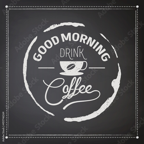 Good Morning. Drink Coffee. Vector Black Square Vintage Chalkboard with Typography Quote, Phrase about Coffee. Placard, Banner. Design Template for Coffee Shop