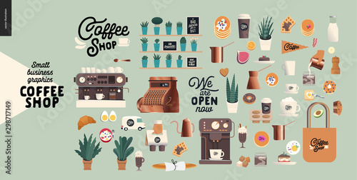 Coffee shop -small business illustrations -constructor set - modern flat vector concept illustration of various coffee cups and mugs, interior decoration, logo, pastry, coffee maker- constructor set