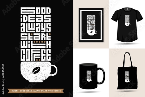 Trendy Typography Quote motivation Tshirt Good Ideas always start with coffee for print. typographic lettering vertical design template poster, mug, tote bag, clothing, and merchandise