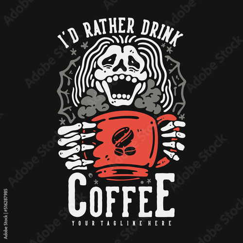 t shirt design i'd rather drink coffee with laughing skeleton holding a mug with black background vintage illustration