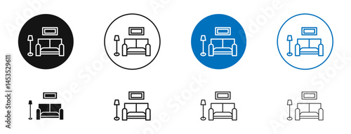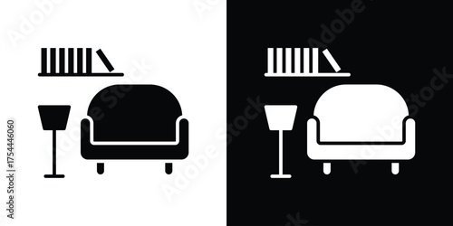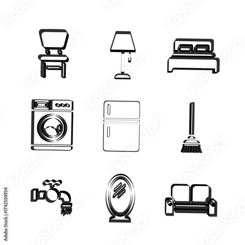 Vector art of a collection of black and white furniture icons representing common household objects and interior design elements