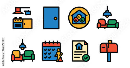 Flat vector icons of co-living and shared spaces: shared kitchen icon, private room door, co-living community badge, utility split document, common lounge area, group cleaning calendar, roommate