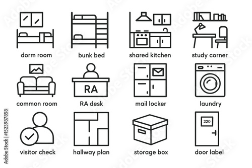 Student Housing Icons. Flat vector icons of student housing: dorm building, room key card, bunk bed, shared bathroom, laundry room